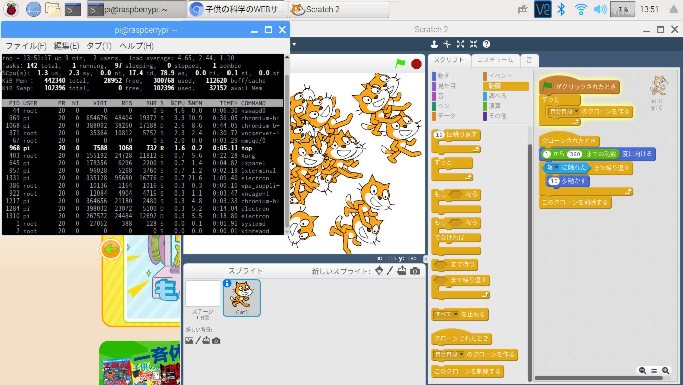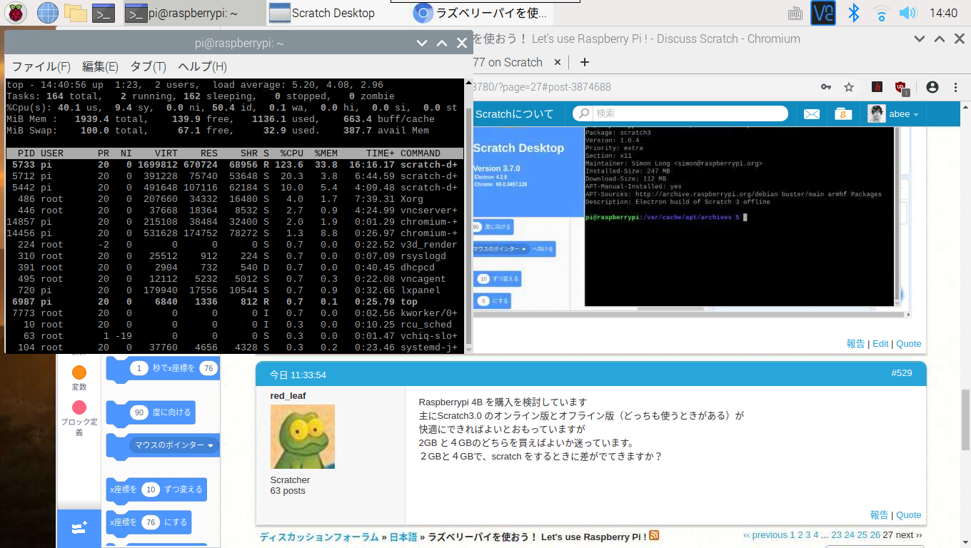 4B 2GBでScratch 3.0 DesktopとChromiumを起動し、Chromium上でもエディターとフォーラムを開いてみました。