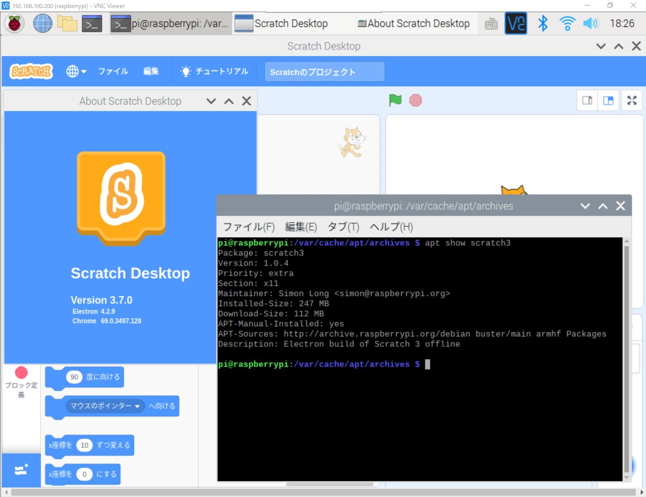 Raspbian Buster用のScratch 3.0 Desktopが、3.7.0になっていました。これはWindowsやmacOS用より新しく、3.6.0のコスチュームが書き出せないなどのバグが直っているようです。