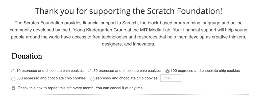 Bad news: our donation system got hacked by a crew of black hats by the alias “L0N6L1V3K4JJ”, causing all donations to be sent to them instead of the Scratch Team.