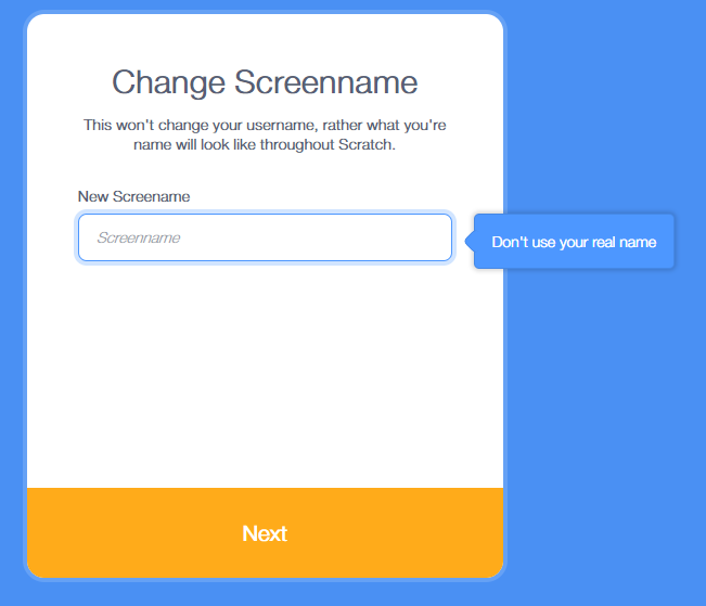 If a user could change their username (or even set a certain “nickname”), this could be very confusing for the Scratch community, especially for those following that user. In addition, this would make moderation of the website more difficult because it would be harder for the Scratch Team to keep an eye on what a user may be doing. The Scratch Team has allowed username changes only on very rare occasions, such as if the username contained inappropriate content or personal information. Generally the Scratch Team does not change usernames on request (such as for reasons like “I do not like my current username anymore”).
