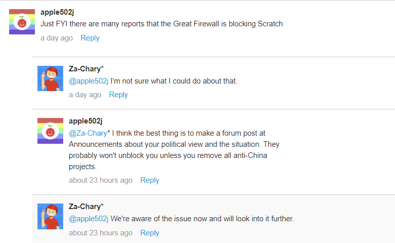 So basically China and HongKong are technically one country currently but, it's not completely like that yet. So, people in HK can still access Scratch and sites like that.But scratchers in mainland China are? I don't quite understand.That's good!Oh no. Goodbye Xamuil2.
