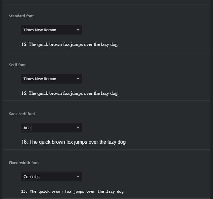 There's a default font, then default fonts per preset. The default sans serif font is separate from the default font.(#12)Yeah i was just saying that if it's brand new and you've never changed the setting, it's likely serif or times new roman. I just checked, however, and there are many more default fonts, but times new roman or serif is likely the default.There are a few preset fonts, like serif, sans-serif, and monospace. What they are set to is configurable.(#10)UMMM… actually, most browser's default font is just serif (without the sans [omg undertale reference?!])