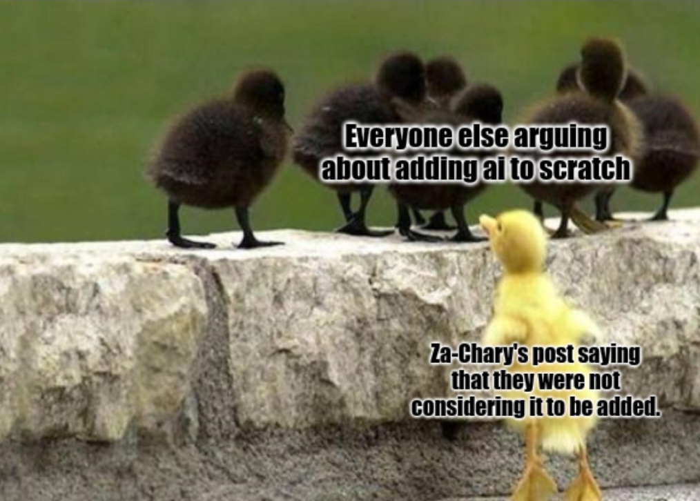 So I'd say your suggestion is already implemented, in a sense: the Scratch Team, at this time, is not considering adding AI image generation to Scratch. My guess as to why the Tweet was made in the first place is just to showcase the possibility of AI image generation within Scratch, and to showcase how cool it can be.Yeah, I guess I was a little confused with the wording. I'm not going to close this topic though because I don't want AI art on Scratch to turn into reality (the chances might be low but they clearly aren't zero).