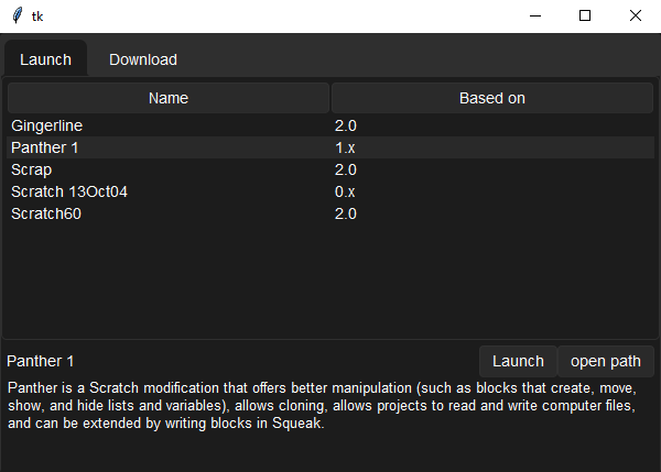 this program is a mess, so im trying to remake it in python with tkinter. so far i have no big issues, but idk how i will do the mod downloading part. i guess that's a problem for later, first i will have to make it launch other types of mods. i will work on it myself a bit first before putting it on githubi recommend you use sv-ttk for this so the ui is nicer