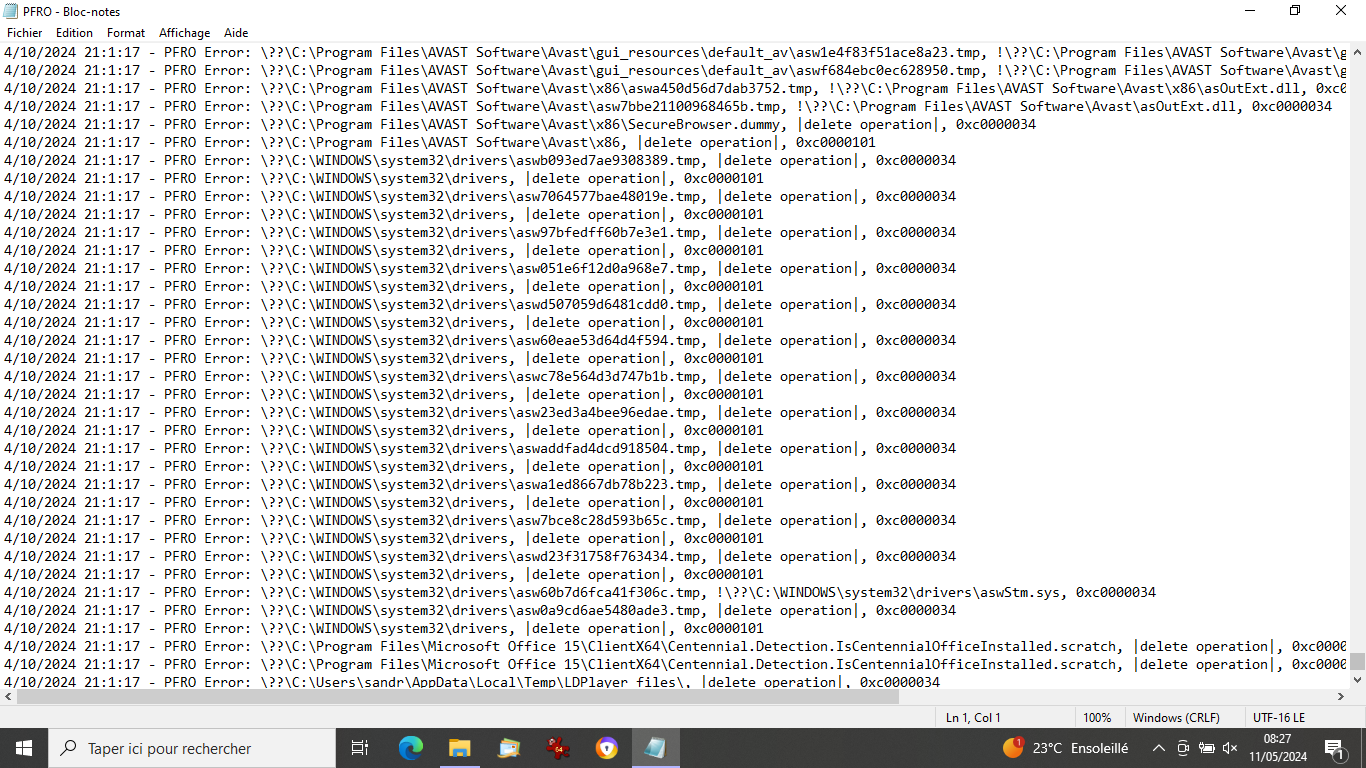 J'ai étudié ta photo et c'est en fait des logs d'une action de ton ordinateur. Il a essayé de supprimer un fichier .tmp qui est sans doute avec ton logiciel Avast. Il a essayer de chercher dans les fichier de avast.exe et il a peut-être trouver un fichier malveillant ou quelque chose comme ça.