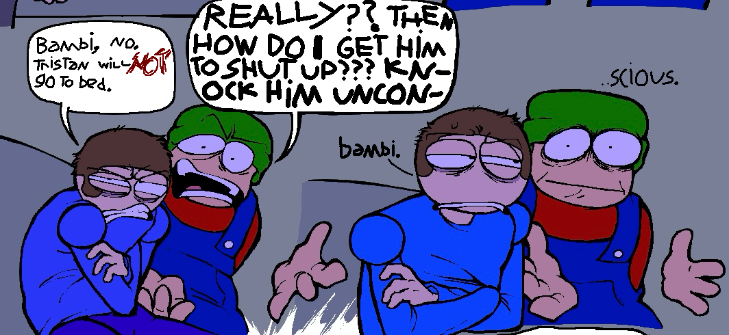 context for the edit: this is one of those days where tristan has stayed up far too long and dave couldnt get him to sleep, so he got bambi to do so instead. the problem is bambi’s thinking skills and the lack of context (to him), so he got some wild ideas in his head.
