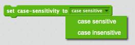 I have some other ideas, in order from best to worst. I'm trying to make CVEDS (Cloud Variable Encoding/Decoding System) and I made the whole program, thinking that it was case-sensitive, only to find out that it wasn't. When I typed in Hello world! it gave me hHeElLoO wWoOrRlLdD! I think thatset case sensitivity to [case-sensitive v]::sensingshould be added.
