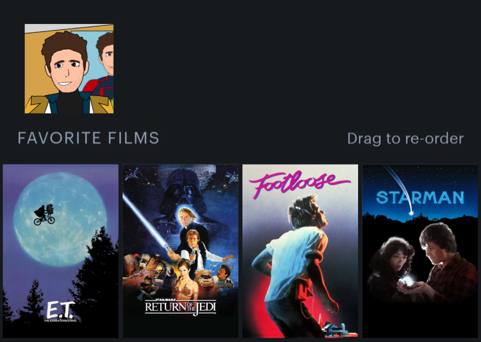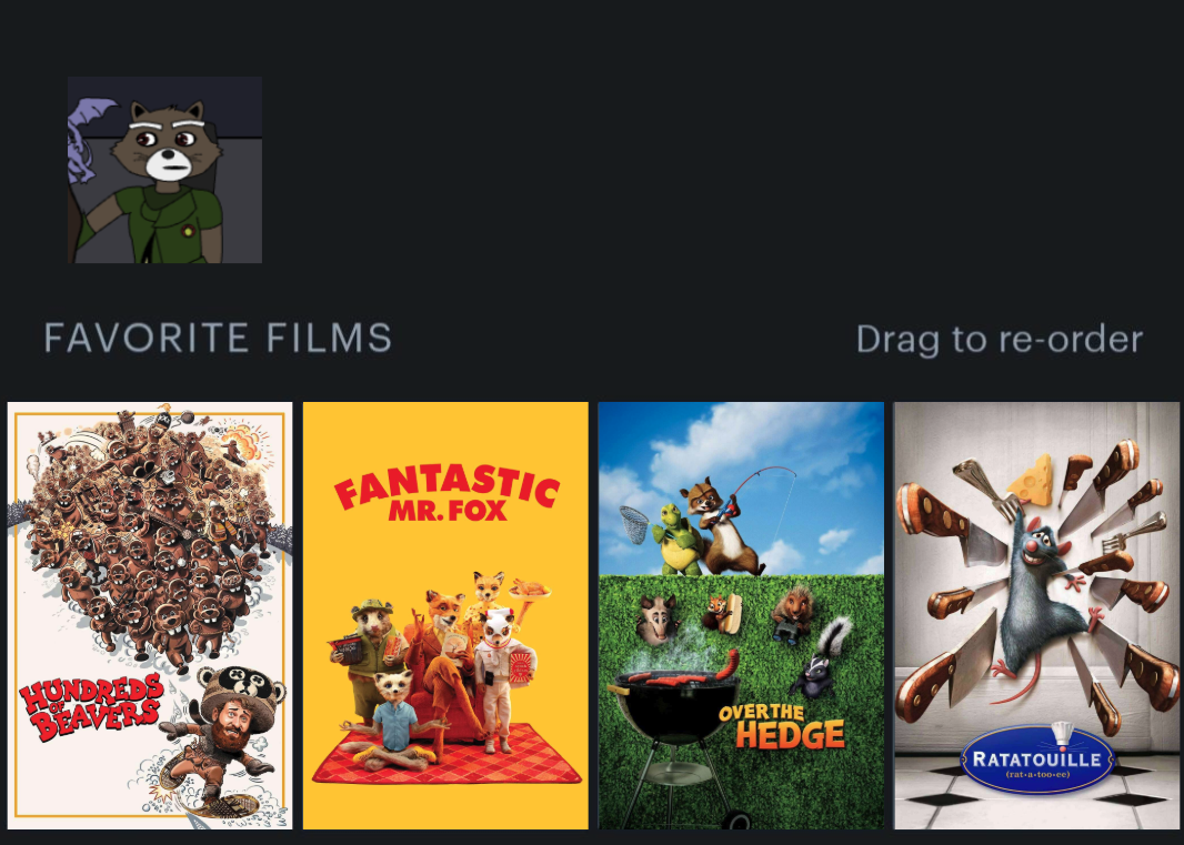 He likes Hundreds of Beavers because it shows violence towards racoons, which is something that he is not.Either those or hyper disturbing movies, because funny.Groot's Top 4:Who's the biggest cinephile in the cast?Realistically due to being on Earth longer it'd have to be either Kitty or Richard.