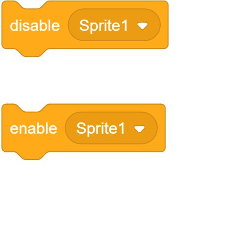 enable [sprite1 v] :: controlto resume the processes. Support only if it pauses loops but doesn't stop them, if the dropdown allows reporter blocks to be placed in it, if all the clones of the sprite also get disabled, and if the sounds the sprite is playing or the wait/glide blocks get paused/resumed as well.