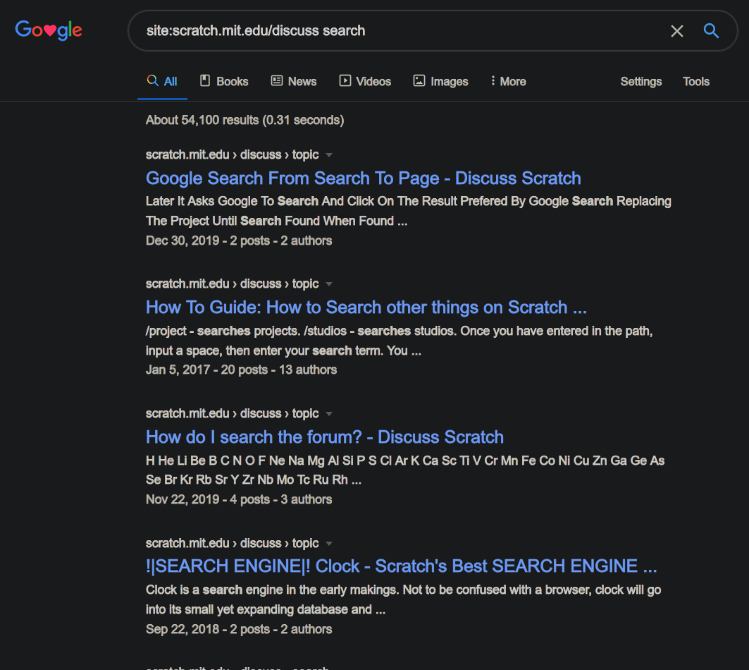 Put “site:scratch.mit.edu/discuss {SEARCH TERM}”