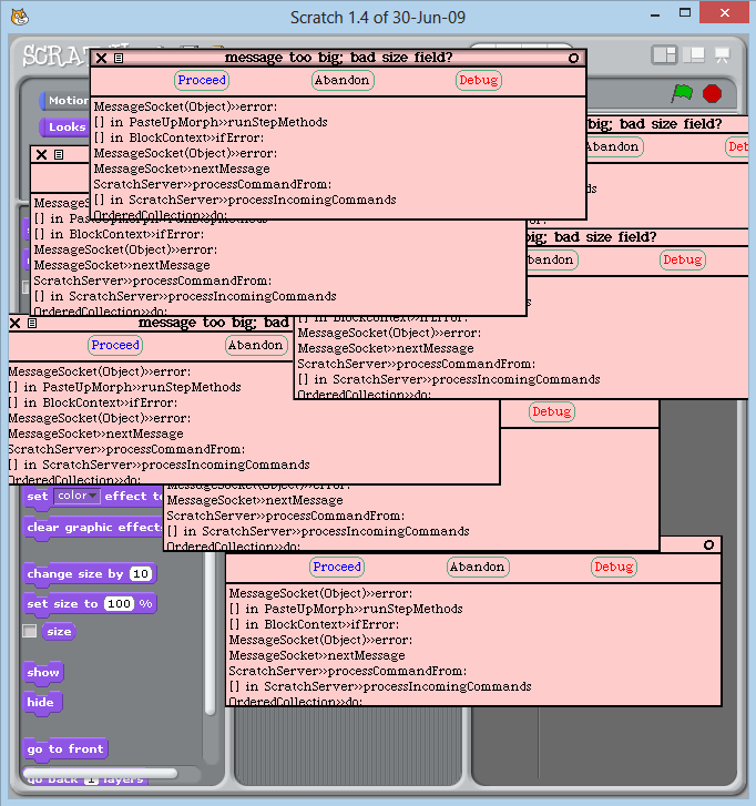 After getting the first error, anything I do causes another one to appear (that includes running scripts and trying to close scratch, which I end up having to do via task manager.)