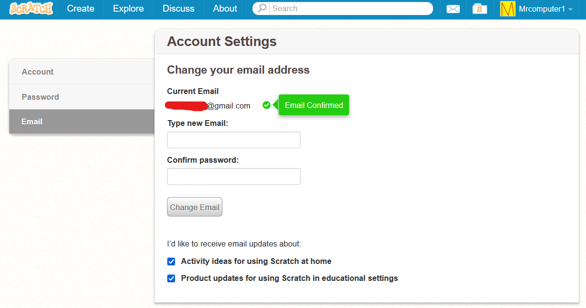 I signed-up for Scratch using my dad's email ID, and he's a person who wouldn't want his inbox filled with stuff about scratch, so can I change that setting now? I know I can change my email here, but how do I make it so that I can receive email updates now?