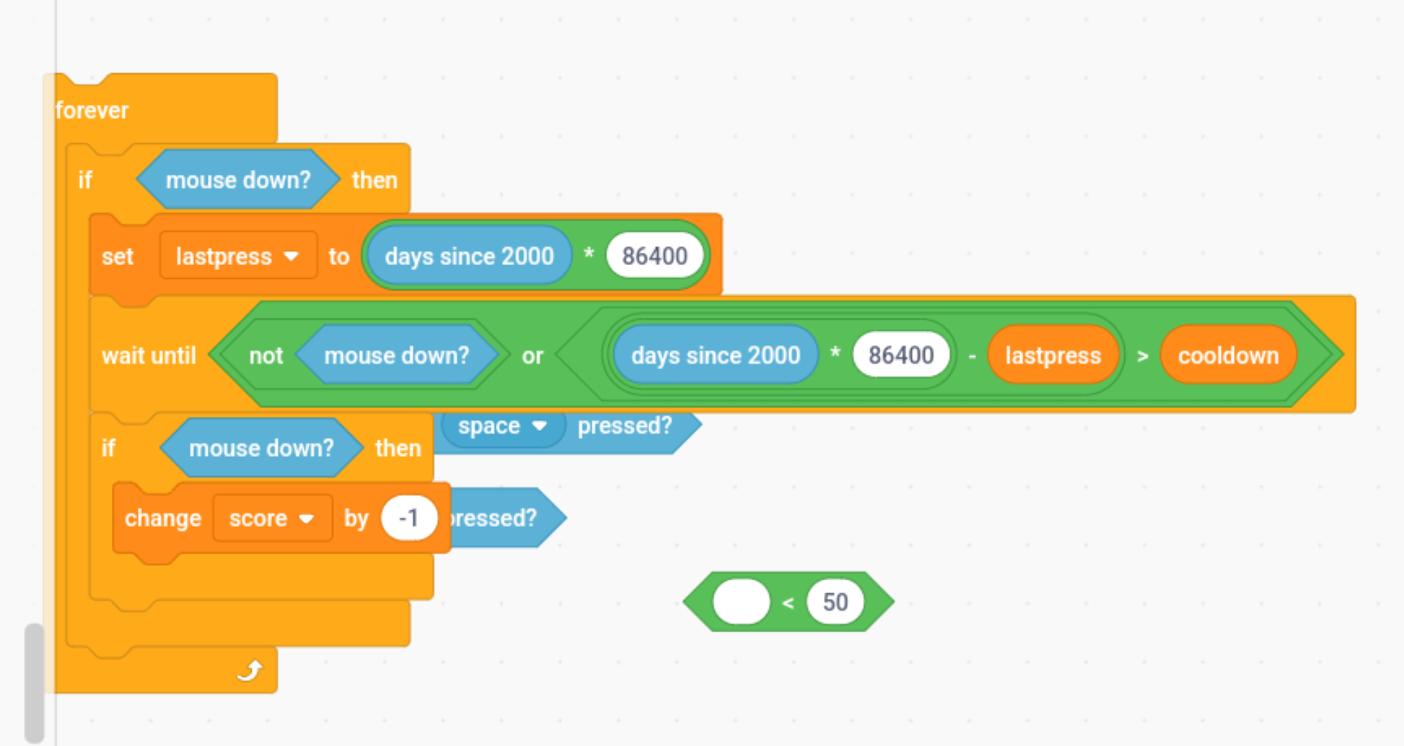 Since the blocks spawn every second, I would recommend a value less than 1You put Also just tried to do what you said, the only thing thats happening is the value of “lastpress” increasing<<not <key [space v] pressed?>> or <((days since 2000) * (86400)) < (lastpress)>>Instead of:<<not <key [space v] pressed?>> or <(((days since 2000) * (86400)) - (lastpress)) > [Cooldown]>>