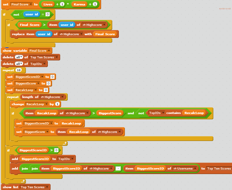 Then, when it is time to calculate your score and show the Top 10 list, I do this: