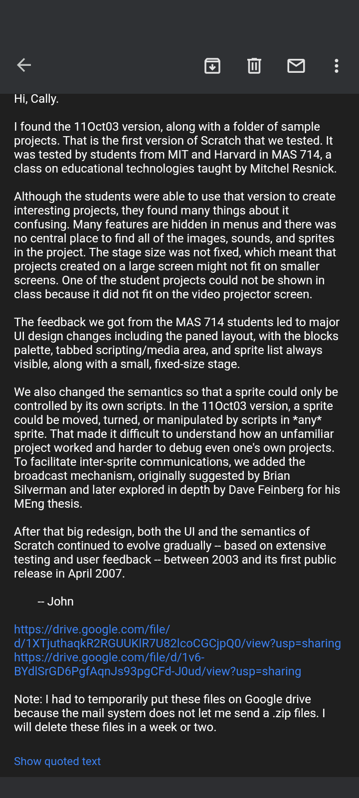 These were core inspirations for the visual part of Scratch's programming environment. As for the shareability of media, that was first introduced by the MIT-hosted Computer Clubhouse program, which started in 1993. It was also a core inspiration for fostering Scratch's community.