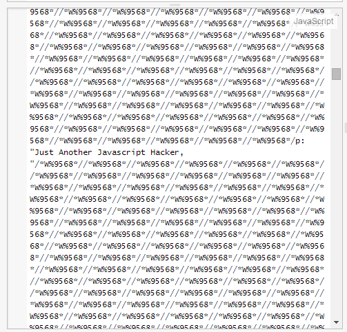 It's a lot of gibberish in comments, remove those lines:console.log("Just Another JavaScript Hacker");