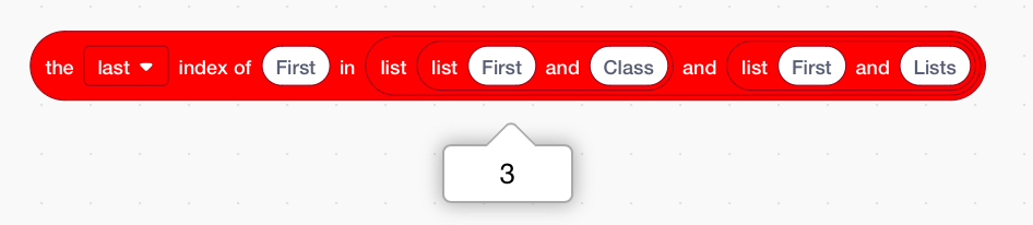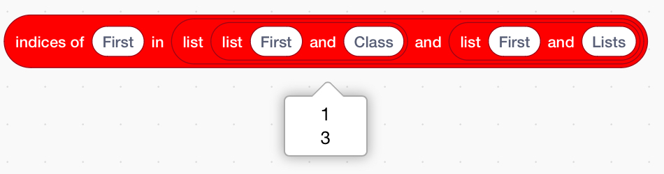 The(Indices of [thing] in (\ \ \:: #590101):: list)Block returns a list of all the item numbers that match the provided string, as an example: