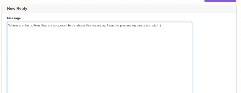 (#4)Try using a different browser or just wait a while. Maybe clear the cache and restart whatever you can as well.They might have failed to load, as the format buttons are loaded in with a bit of JavaScript. Try reloading maybe?They are still gone and I've been switching from topic to topic a lot, yet they are still gone.