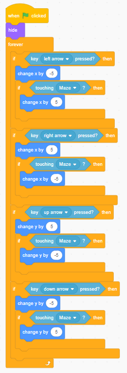 Replace maze with the script that you use for the the thing you want to colide with, and you dont need the hide block. You might have to edit this a little if youre not doing a birdseye veiw