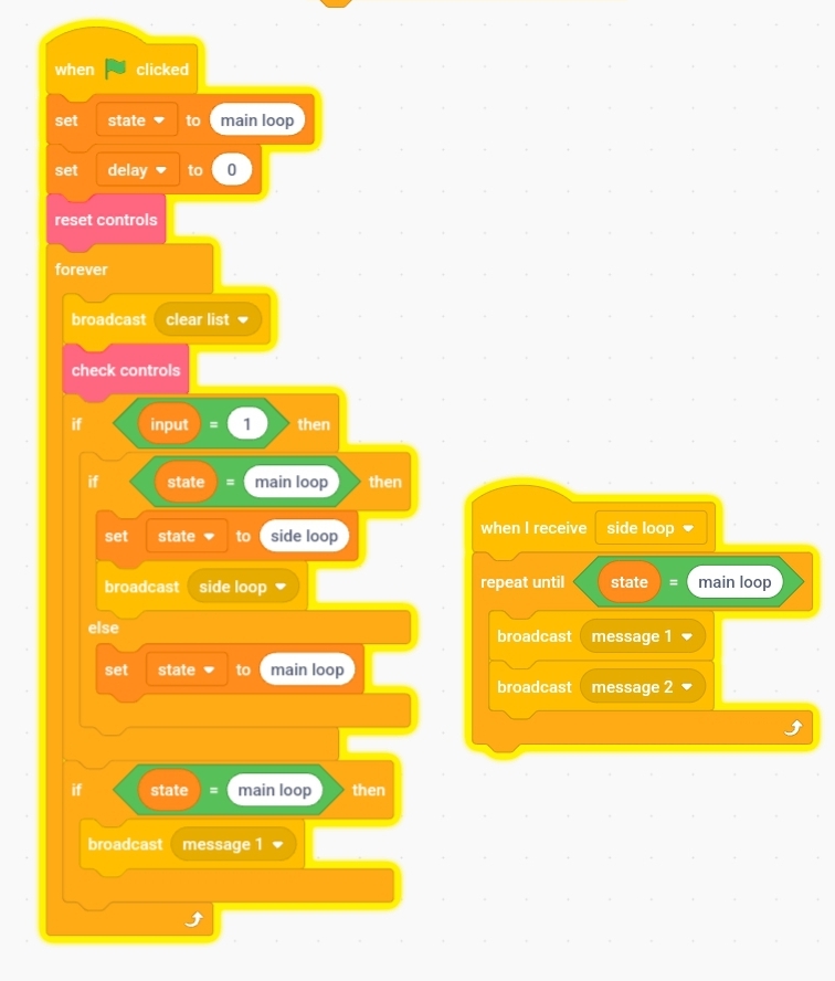 Then it transported to the if input=1 loop. The message 1 broadcast (main loop) was still in process, so message 1 (side loop) is not in process.