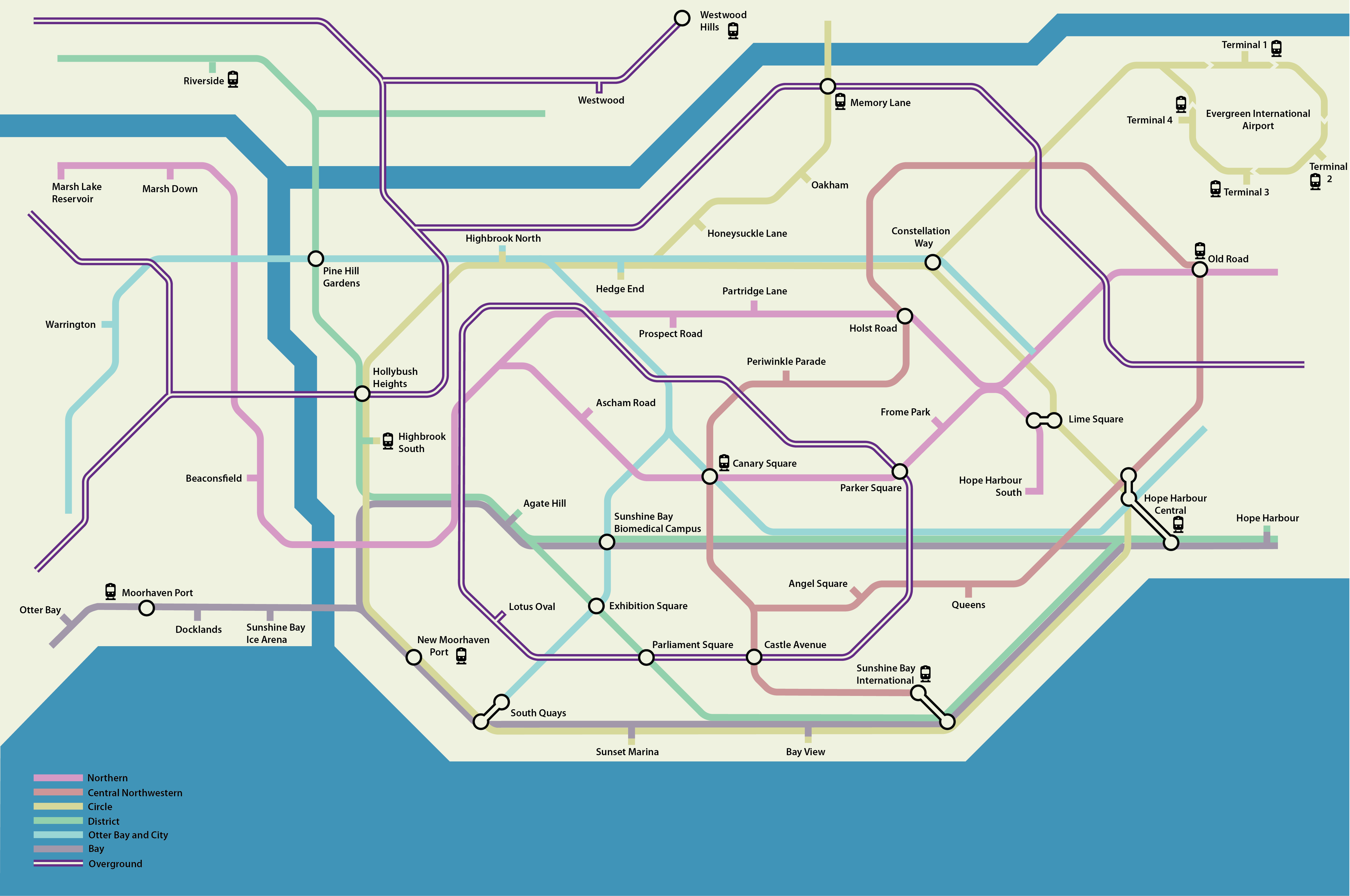 Sunshine Bay’s metro primarily operates within the densely populated City of Sunshine Bay, and is operated by TfSB. Sunshine Bay’s Metro has 6 underground lines, and 1 technically mainline railway service (the overground). The metro is operated very similarly to the London Underground with scheduled train service, due to the complicated nature of some lines (especially the Northern and District Lines). Sunshine Bay’s metro is middle-aged, and was built around the same time other major metros were being constructed. All the platforms have platform screen doors installed on them (with the exception of any above ground stations). The metro is extensive, as the city and its surrounding districts are quite large.