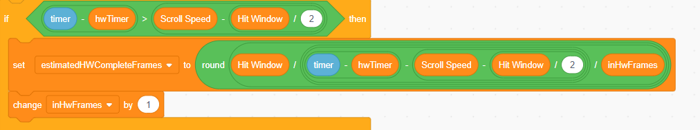 First, we're gonna have to make the note estimate how long they will be in the hit window, in FRAMES, not seconds. I don't want to recreate the whole thing but this is what I did to estimate how many frames it takes. hwTimer is basically just the start timer from earlier.
