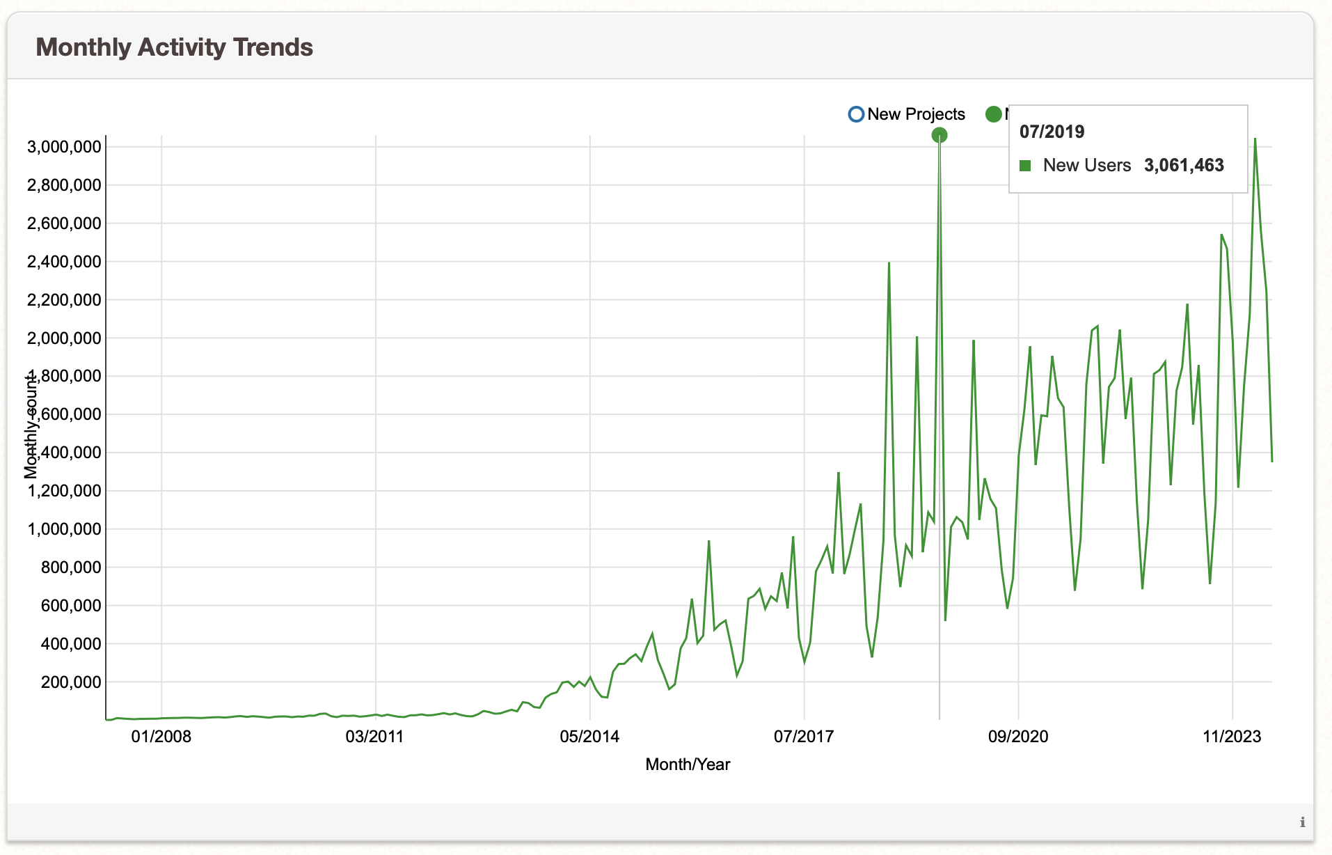 https://scratch.mit.edu/projects/1100126051/Looks consistent with OP's screenshot: the number of new users (the green line) had a peak at 07/2019.