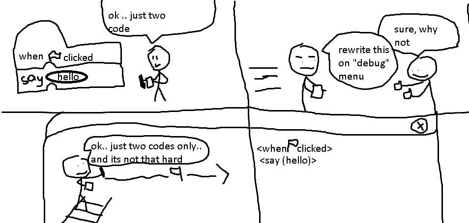 But also, I'm not entirely sure how such a Debug menu would work anyway. Scratch has no syntax errors, so the Debug menu would only be useful in deducing unintentional outcomes of the code. But how is a computer supposed to know what you meant to program? If you encounter a bug in Scratch code, it's because the project is doing what you told it to do, in some sense, so how is a debug menu supposed to know what you want it to do?