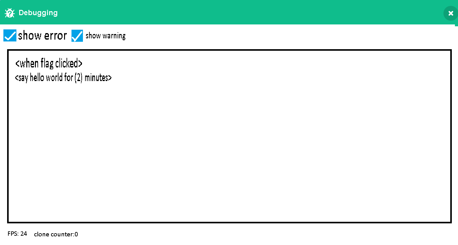 It could be like this:I think the current Debug menu is useful because it encourages Scratchers to think about how they can debug their own program, rather than relying on some external tool to give the solution to them.I agree. When you code something wrong, it's doing what you told it to do, not what you wanted it to do. Computers can't read your mind.