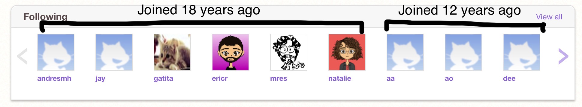hereNo no no, I don’t think you understand what I’m saying about the following list in the profile page being sorted in the order of when the user joined scratch.Can you link the account you referenced above? On my profile page, there's users who joined 11 years ago listed after users who joined 4 years ago. That order is also the order in which I followed them.