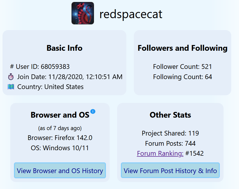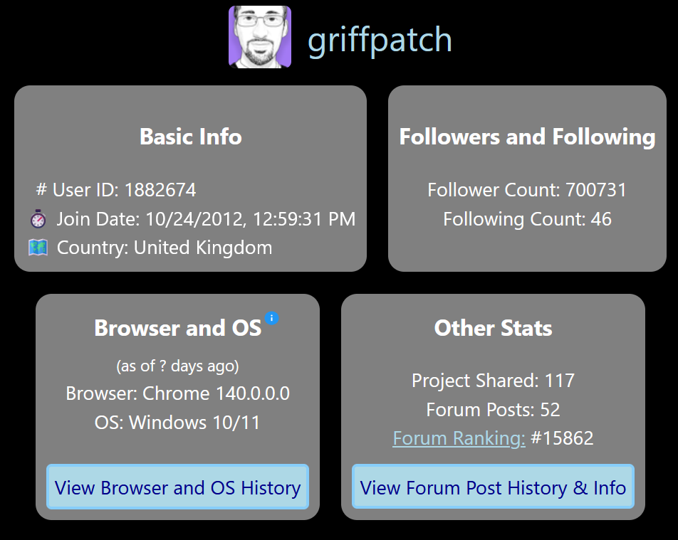 Since ScratchStats is down, I made Scratch Info!