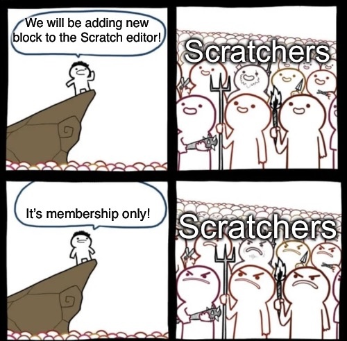 i think it would be cool if there were new blocks for membership because it just makes sense, you're paying money to have more stuff like sprites and blocks, AND you're helping scratch donate to multiple businesses that help children