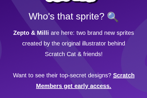 User mali3000 recently showed to us images of a Scratch Newsletter of 2 new Scratch Mascots, Zepto and Milli. As of now, you need to have Scratch Membership to use them, and that can be expensive.
