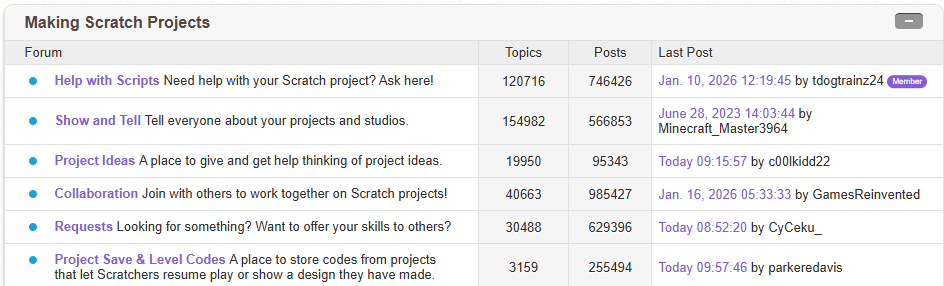 So basically the glitch is that it is showing the incorrect last post randomly. When I refresh it doesn't change, but when I wait sometime then refresh it changes. For example, show and tell says it is from 2023 for me. Yet, a few minutes prior, it was MY last post that it showed. I also saw this for Help with Scripts and collaboration. Probably happens with other topics too.