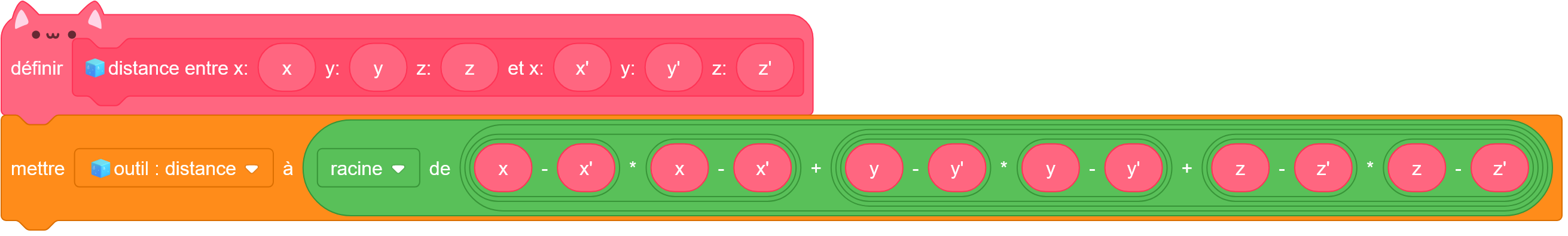 sqrt((Xcam-x)^2+(Ycam-y)^2+(Zcam-z)^2)Bonjour, votre code pour avoir une distance est pourtant bon, voici le vrai calcul scratch :